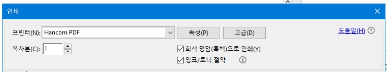 아래한글이 설치된 경우 Hancom PDF로 인쇄를 할 수 있는데 어도비 뷰어에서 pdf파일을 읽어들인 후 Hancom PDF로 인쇄하는 경우 용량을 줄일 수 있다. 회색 명암(흑백)으로 인쇄, 잉크/토너 절약 이 부분을 체크하면 줄일 수 있다.