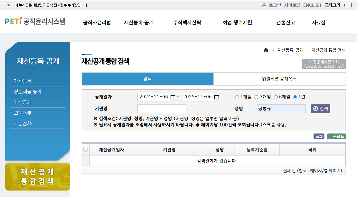 고위공직자의 재산을 조회할 수 있는 사이트.